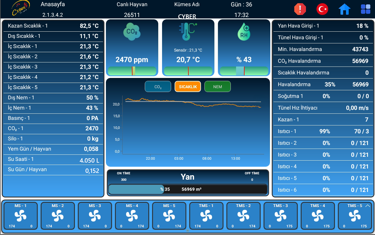 Otomatik Mod: Fanlarınızın çalışma sürelerini Otomasyon programı kendi ayarlar. Yapay zeka destekli bu bölümde program ne kadar havalandırma ihtiyacı olduğunu ve bunun için hangi fanların ne kadar süre çalışacağını hesap eder. Otomatik Mod da olan fanlar ile havalandırmayı gerçekleştirir. Otomatik modda çalışan fanların rengi beyazdır.