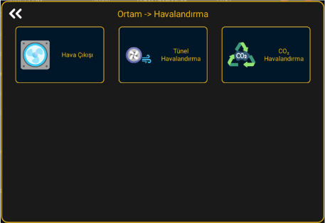 Bu bölümde Havalandırma ile ilgili tüm ayarlar ve bilgilere ulaşabilirsiniz. Bu Menü 3 kısıma ayrılmıştır: Hava Çıkışı, Tünel Havalandırma, CO² Havalandırma.