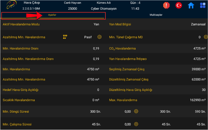 Ayarlar sekmesinde Aktif Havalandırma modunuz yazar. Yan tarafında ise Havalandırmayı nasıl yaptığı yazar. Örneğin "Zamansal" Altında ise sırasıyla; Azaltılmış Min. Havalandırma (Aktif/Pasif), Min. Havalandırma Oranı, Azaltılmış Min. Havalandırma Oranı, Min. Havalandırma , Azaltılmış Min Havalandırma, Hedef Hava Giriş Açıklığı, Sıcaklık Havalandırma, Min. Döngü Süresi, Mi. Çalışma Süresi, Min. Tünel Çağırma M³, CO² Havalandırma, Yan havalandırma İhtiyacı, Seçilmiş Zamansal Çıkış, Düzeltilmiş Zamansal Çıkış, Düzeltilmiş Hava Giriş Açıklığı, Max Havalandırma ayar ve bilgileri bulunur.