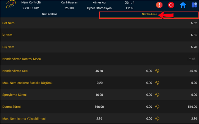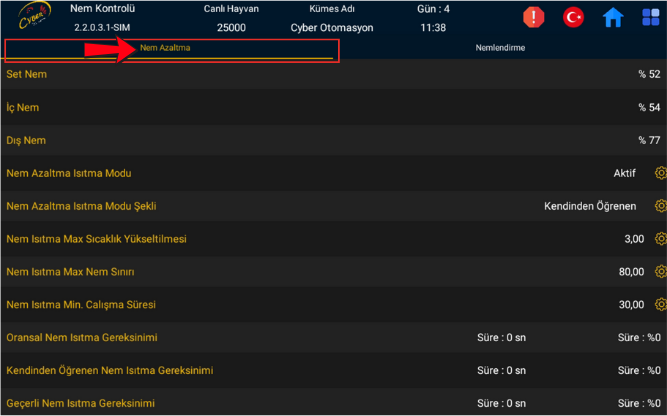 Ortam > Nem Kontrol Bölümünde 2 ayrı sekme bulunur. Nem Azaltma ve Nemlendirme.