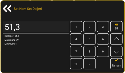 Bu sayfada istediğiniz tüm değişkenler için set değeri belirleyebilirsiniz. İstediğiniz birimin satır sonunda bulunan dişli görseline dokunun istediğiniz değeri girerek tamam tuşuna basınız.